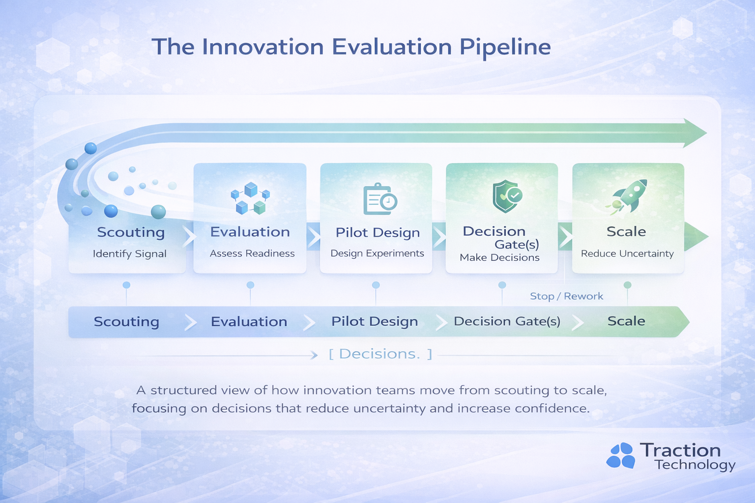 At a high level, innovation evaluation is not a funnel — it’s a sequence of decisions designed to reduce uncertainty at each stage. The illustration below shows how leading teams move from broad technology scouting to focused pilots and, ultimately, production decisions.